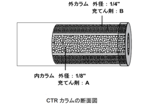 CTRカラムは左の断面図のように、外径1/4″のカラムの中に外径1/8″のカラムが入った二重構造をしています。二重構造によって、AとBの二種類の充てん剤を同時に使用して分析することが可能です。